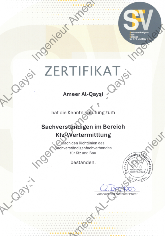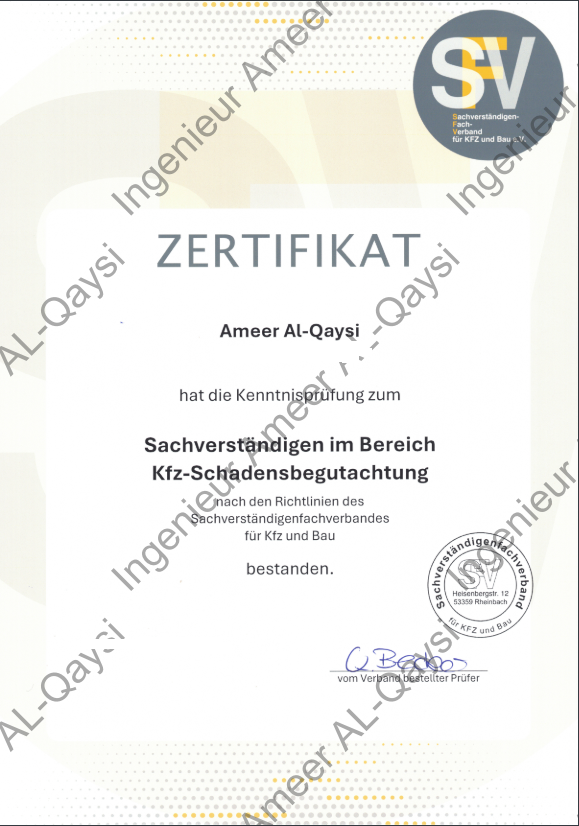 Zusätzlich habe ich die SFV-Prüfung erfolgreich bestanden und verfüge über anerkannte Zertifikate in der Kfz-Schadenbegutachtung sowie in der Kfz-Wertermittlung.